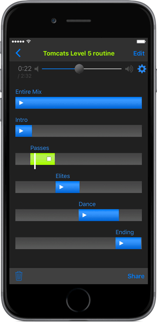 Coaching a music-based routine usually involves the annoying process of repeatedly "scrubbing" to find the right part of the routine to play while your team is practicing that part. It's also tedious to get your routine music (usually an mp3 emailed to you) stored locally into your phone's music app.