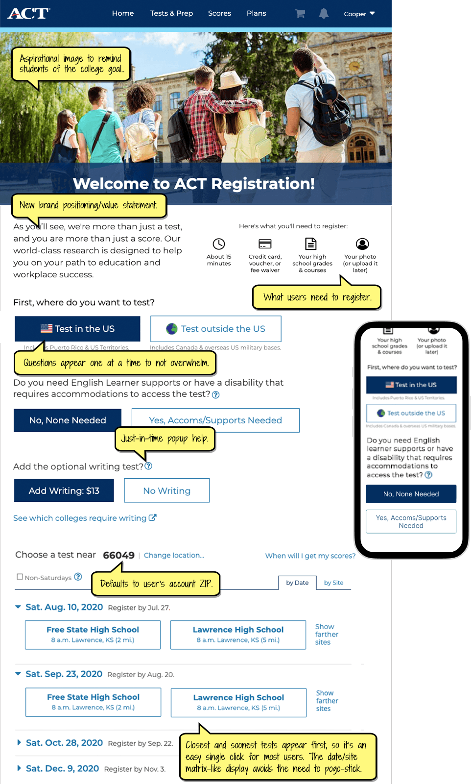ACT's outdated non-responsive 40-minute test registration process was hurting the brand experience, and the crumbling platform limited future progress.